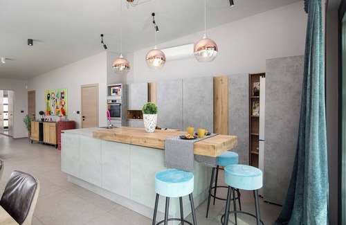 The Villa Maell is a luxury villa located in the small charming village of Sisan only 3 km away from the tourist village of Medulin. If you are searching for a modern villa with private pool in Pula, Villa Maell is your perfect choice! Villa Maell is a beautiful and modern villa located on unique property of 2000m2. This design villa has a tastefully and designed decorated interior and can accommodate up to 8 +2 guests. All bedrrooms have a private bathroom with shower, air conditioning and smart TV. In the garden there is a big private swimming pool surrounded by beautiful green nature. This amazing house consists of a spacious bright living room with direct access to the terrace and pool, four bedrooms and four bathrooms. The kitchen is spacious ,modern and fully equipped and also connected with the exterior. The wonderful villa Maell is completely air conditioned, has WiFi, underfloor heating system, private parking for 4 cars and provides everything for a relaxing holiday. Outside is a kids playground with swings, trampolin, football playground and volleyball playground.