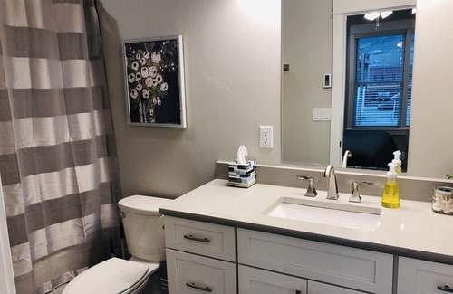 Upstairs you'll find a new washer and dryer and the supplies needed to use them. Two master bedroom suites, one with a king bed and the other with one queen bed, both with fresh linens and bathrooms with complimentary toiletries (one walk-in shower, one bathtub).