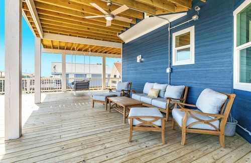 Step inside to discover an inverted floor plan that provides 360 degrees of ocean and bay views. This new construction has a beautifully appointed interior, featuring coastal-inspired décor and all the amenities you need for a memorable stay. The top main level offers spacious living area is perfect for gathering with family and friends, while the fully-equipped gourmet kitchen invites you to prepare delicious meals with ease. Each level offers spacious outdoor deck space to take in the breathtaking views while you catch some rays, play games with your family or take a nap in the breezy, salty air. After a day of sun and surf, retreat to one of the cozy bedrooms, each offering plush bedding,