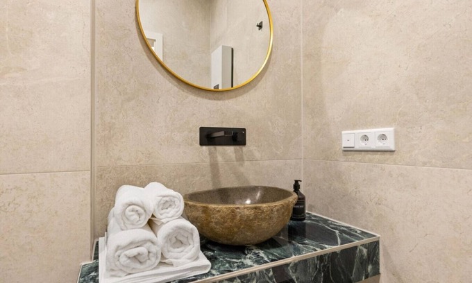 The newly renovated bathroom has a walk-in rain shower. The entire bathroom has high-quality tiles and a natural stone sink.