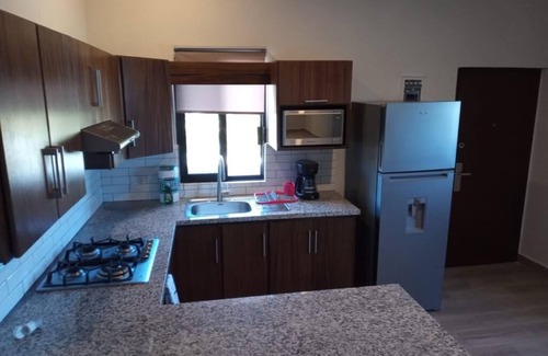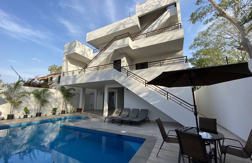 New modern studio located in the residential area of Rincon de Guayabitos, a short 5 minute walk from the beach and short drive from downtown Guayabitos. This third floor studio has a full kitchen and bath. New pool and back patio!