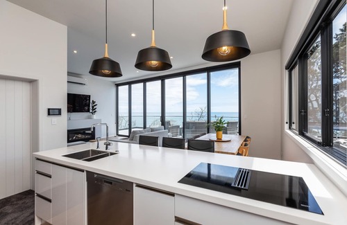 The living areas are open plan. Large sliding doors open to the private front deck with stunning beach front sea views. The large deck is perfect for outdoor dining and entertaining all year round.