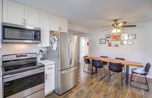 The dining room is adjacent to the kitchen with a table for 6 guests. The new kitchen is bright and modernly designed with spacious quartz countertops perfect for prepping and cooking meals at home and white shaker cabinets with ample pantry space. New stainless steel appliances include dishwasher, stove, oven, microwave, and double door refrigerator with a lower freezer compartment.