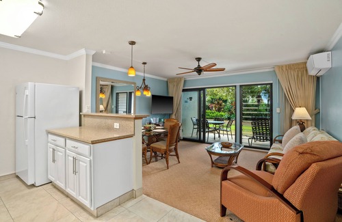 The spacious living and dining area opens to your own private lanai just steps away from the only heated of three pools on the property. The fully equipped kitchen features granite countertops and all the amenities needed to prepare your favorite island fare. The air conditioned bedroom includes a queen-size bed, while the living room's brand new queen sleeper sofa accommodates additional guests.