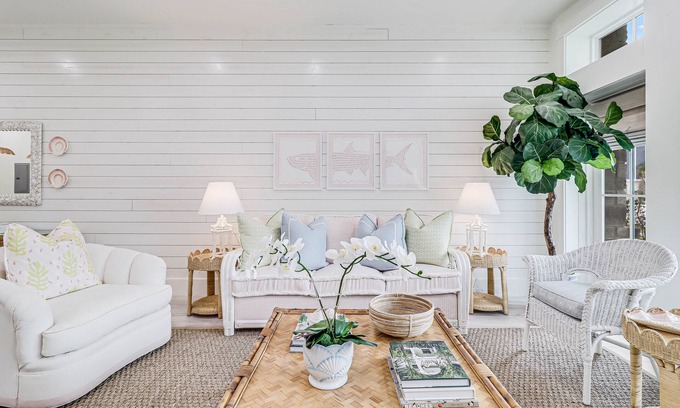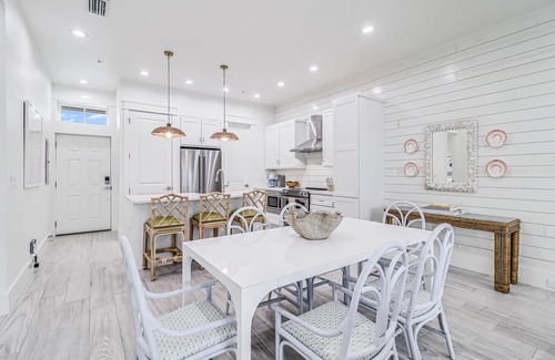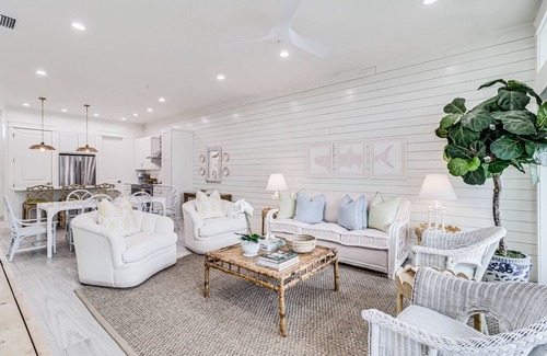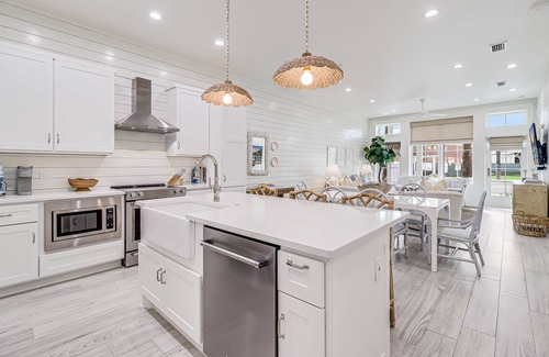 MAIN LIVING SPACE: Wrapped in all-white shiplap, the airy main living space brings everyone together with den, dining, and kitchen. Relax on all-white sofas or wicker chairs near the flat-screen TV. The dining table for six hosts meals or game time, while a breakfast bar seats three at the kitchen island. The well-equipped kitchen with stainless appliances and white cabinetry has everything you need!
