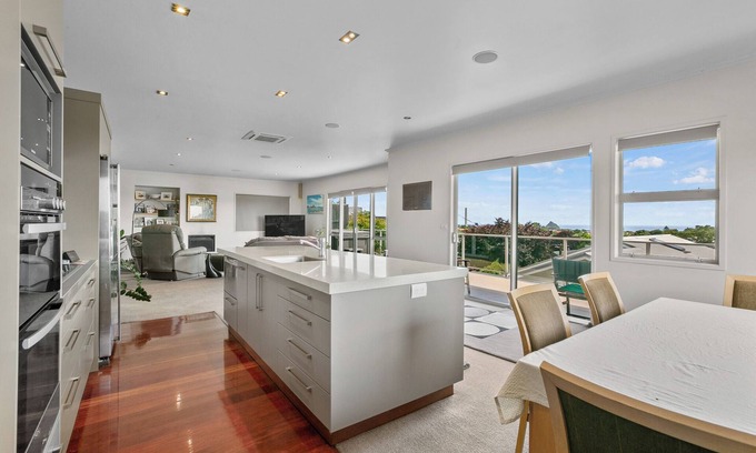 Escape to this stunning modern retreat, where relaxation meets breathtaking coastal views. This beautifully designed home features an inviting open-plan layout that seamlessly connects the kitchen, dining, and lounging areas—perfect for socializing or unwinding in style. Step out onto the spacious north-facing deck, furnished with comfortable seating, and soak in the sun as you gaze along the coastline. The highlight? A luxurious hot tub that promises pure relaxation with a view to die for. With secure double garage parking, this home offers both comfort and peace of mind. Perfect for a memorable getaway!