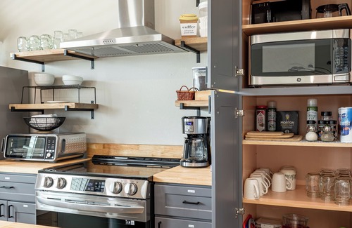 - We ALSO provide: 6 keurig cups, coffee grounds, filters, tea, sugar, creamer, salt, pepper, olive oil spray for cooking.