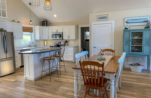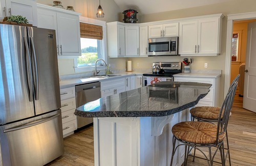 The open concept property has expansive ocean views through an 18 foot stretch of windows from the central kitchen, dining and living areas. Guests can also enjoy ocean views from the master and queen bedrooms. The kitchen is bright and spacious with a large granite top island that seats two. There is ample counter space and storage, stainless steel appliances and a great countryside view from the kitchen window. A half bath is conveniently located off the right side of the kitchen as you enter the cottage.
