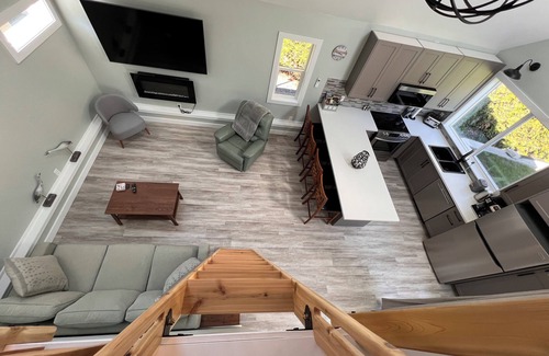 Vaulted 15’ ceiling creates a large space to relax, work and sleep. Two single bed are accessed via a loft ladder which provides the children with a space of their own. See the bright loving space with two skylights, cedar beams and chandelier. Our 2023 completed house has everything you’ll need including : 75” Tv and 65” TV, WiFi , full size fridge.