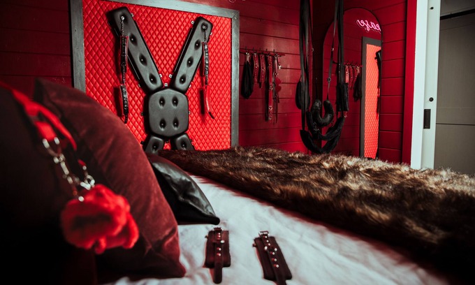 Step into a fantasy brought to life—dim lighting, plush King bed with discreet restraints, and freedom to explore your desires. Surrender or take control in a space built for indulgence. Heat things up with the Bondage Cross, a striking symbol of dominance, or playfully restrain your partner in the Sex Swing for endless submission and motion.