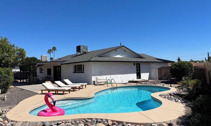 Beautiful newly renovated and tastefully styled home in Tempe. 10 minutes to ASU, 15 minutes to Old Town Scottsdale, 15 minutes to Phoenix airport. Quiet & peaceful neighbourhood, steps to shopping, parks and restaurants. Amenities include sparkling pool (unheated), yard games, smart tv with streaming services, high speed wifi, charcoal BBQ, parking, coffee maker, toaster, oven, dishwasher, laundry and more.