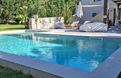 Our private villa consists of a two storey building of two separate apartments that is rented as a whole. The ground floor consists of a bedroom with integrated bathroom. Features a 28-inch flat-screen TV and A / C for air conditioning and heating. The dimension of the bed is: 160cm * 200cm. The second bedroom has two single beds of 90×200cm each that can turn into a quwen size bed, with A/C, and TV. There is also a living room with a small kitchen and a bathroom. The first floor consists of one bedroom with a double bed with dimensions 160*200 and an integrated bathroom. The bedroom has a 32-inch flat-screen TV and A / C for coolness and heating. It also has a living room with A/C and an extra sofa that is converted to bed with dimensions 140cm * 183cm. The living room has also a 55-inch flat-screen TV and a bathroom. The kitchen has a dining area, microwave, French coffee machine, Nespresso coffee machine, kettle, toaster and A / C. All windows have screens for insects. The house has a large courtyard with dining area, private pool of 40sq meters, sun loungers. BBQ area, on-site parking. Balcony and outside shower are also available.