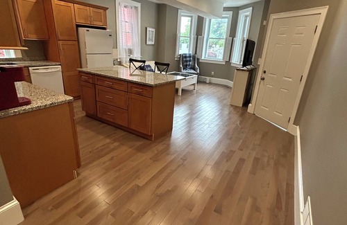 Newly renovated first floor, 2 bedroom rental located in Downtown Newport! This premium location is within blocks of St. Anne’s Square, Bowen’s and Bannister’s Wharf, Thames, Bellevue, Broadway, Tennis Hall of Fame, Museums, Movie Theater, Comedy Theater, Cliff Walk , Beaches, and an abundance of restaurants, shops, and harbor. Large bright kitchen with granite countertops and kitchen island. Adjacent living room area perfect for relaxing. Further down the hall there are two bedrooms, both with queen size beds and plenty of closet space. One has huge walk in closet. Back in the living area relax near the open bay windows overlooking broadway street, but on a beautiful prestigious neighborhood street. Free WiFi, cable. parking is not included but there is some free street parking one block away. Please feel free to reach out with any questions regarding dates and times.