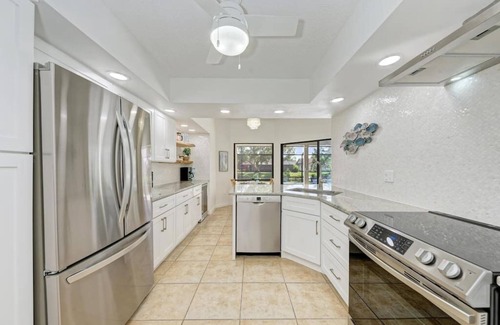 The kitchen has new granite countertops and full-sized stainless appliances, including a separate beverage fridge to keep your drinks and cocktails cold. It is fully equipped with everything you need to cook, bake, or grill, a drip and Keurig coffee maker, French press, kettle, microwave, toaster, and blender. A full-sized washer and dryer is located in the home.