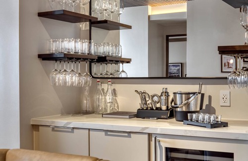 - **Gourmet Culinary Delights:** A state-of-the-art kitchen equipped with Gaggenau appliances is complemented by a dry bar and an undercabinet beverage refrigerator and a refined selection of glassware.