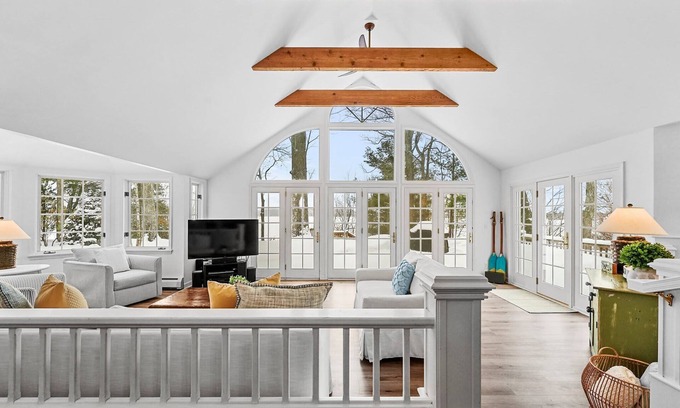 Outdoors: Expansive private deck, fire pit, grill, and stairs leading directly to the beach where you will find an additional fire pit, private dock and mooring ball (available Memorial Day to Labor Day each year). This home offers 2 Bikes, 3 Kayaks, and 1 Stand- Up Paddle Board for guest use!