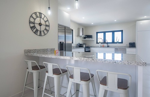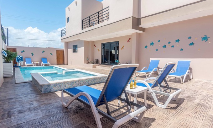Summer Sol Villa - Indulge in luxury living at this magnificent brand-new villa, nestled on Palm Beach, Aruba. With access to the Caribbean's most stunning beaches, an array of dining options, vibrant bars, and thrilling excursions await just a leisurely 5 minute walk. This grand 8-bedroom, 8.5-bathroom sanctuary exudes spaciousness and style. Enjoy lavish amenities including a sparkling pool with a sun lounge, a rejuvenating Jetted tub, & an outdoor bar equipped with a TV & cozy seating.