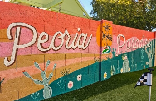 Step outside to our outdoor oasis, where you'll find a heated pool perfect for year-round enjoyment. The 'Peoria Paradise' mural was completed by a local artist. For those seeking some friendly competition, our property features a mini golf course, a sports court, and a game room equipped with air hockey, foosball, arcade games, connect 4, pool table, and ping pong. Take a break and relax by the fire pit or on the comfortable loungers while enjoying a meal at the outdoor dining table. Grill enthusiasts will love the BBQ grill and outdoor swings provide the perfect spot for relaxation. There is also another fridge in the garage that is available for use!