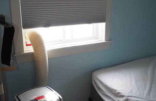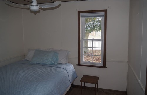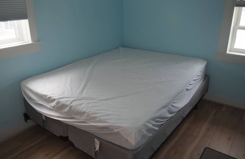 The bungalow has 3 bedrooms and 1.5 bathrooms. One of the bedrooms and the full bathroom are located on the first floor. The other 2 bedrooms and the half-bathroom are located on the second floor. The first floor bedroom has a queen-size bed and the two upstairs bedrooms each have full-size beds. There is a window A/C unit in one of the upstairs bedrooms to cool the upstairs. The home has a natural gas forced-air furnace for heating. The home has Wi-Fi and a television with live streaming.