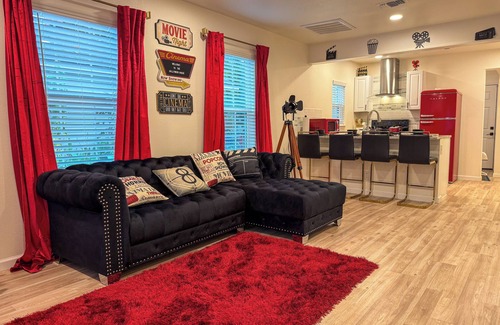 Welcome to the Hollywood House—where every room is a scene! This 3-bedroom getaway features Wild West, Back to the Future, and Casablanca-themed rooms. Enjoy a stylish Hollywood vibe throughout, a cozy backyard with picnic setup, gated parking, 2 large 55” TVs, and a prime downtown San Antonio location. Lights, camera, relax!