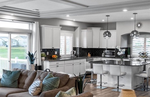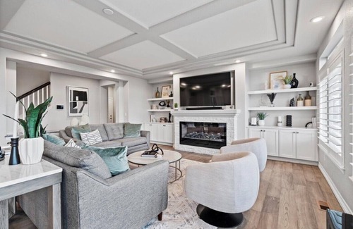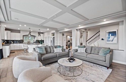 Our home is your dream getaway nestled in the heart of serene surroundings and offers an unparalleled experience with its thoughtful design, lavish amenities, and captivating features! With a total of 3 king bedrooms that have en-suite bathrooms, 2 queen bedrooms, 2 full/double bedrooms, and a bunk bed, our expansive property comfortably accommodates large groups, ensuring everyone has their private haven. The main suite is stunning, with a private patio overlooking the backyard and golf course and a spa-level en-suite bathroom with a soaking tub and two shower heads. The primary bedroom patio is the perfect place to watch the sunset on your own if you need some time away from the crowded common areas.