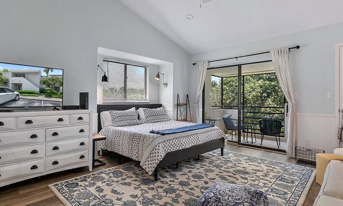 Perfect location for a beach get away or Mayo patient visit. This completely renovated second floor studio has it all and then some!End unit, bright and airy with vaulted ceiling, New kitchen cabinets, solid surface countertops, stainless steel appliances and walk in shower. King size bed and pull out queen sofa.Lovely screened balcony overlooking the Sawgrass Preserve. Easy beach access! Less than 5 minutes to shopping and restaurants and less than 15 minutes to Mayo!Available weekly or monthly.