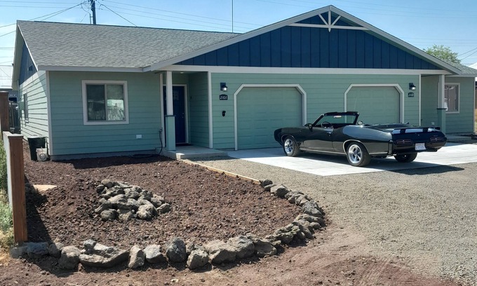 This half of a newly built townhouse boasts 1100 Square ft. of comfort and modern amenities. There's a full kitchen with new appliances (including a dishwasher!), outfitted with cooking and eating utensils, knives (be careful, they're sharp!) dishes, pots and pans, coffee maker, and Keurig. Coffee, tea, condiments, and spices are provided. There's a bar height eating area as well as a dining table and chairs (2 extra chairs are stored in the bedrooms). The living area features comfortable seating, a smart tv with access to multiple free channels, and a 14000 BTU a/c unit that easily cools the whole house. Books for adults and kids are available if that's more your vibe. You'll have your own private patio with a propane barbeque grill (available May-October), and table and chairs for dining outside. Wifi is available for all your internet needs. The master bedroom has a brand new king size mattress. There's a dresser available as well as a walk-in closet off the master bathroom, for storing your clothes. Complimentary hair dryer, toiletries, and linens are there for you to use. The living room and master bedroom are located at the back of the house which makes for a nice, private and quiet stay. The guest bedroom has a new queen mattress and a large closet. The guest bath has a full tub/shower with complimentary toiletries. The washer and dryer are located here, with laundry soap and dryer sheets for your use. There is a 19 ft. deep, single car garage to secure your collector car, motorcycle, or anything else you want to secure during your stay. The class 2 EV charger is located just inside, on the wall. Due to insurance restrictions, we ask that you please not park your EV in the garage. This home is centrally located with the Goldendale Observatory State Park, to the north, and the Columbia River and wineries to the south. Downtown you'll find restaurants and The Presby Museum. There is a city pool with a disc golf course, and hiking trails located on Observatory Hill. There are 2 grocery stores available (one is just a few blocks away) to stock up on food or other items during your stay.