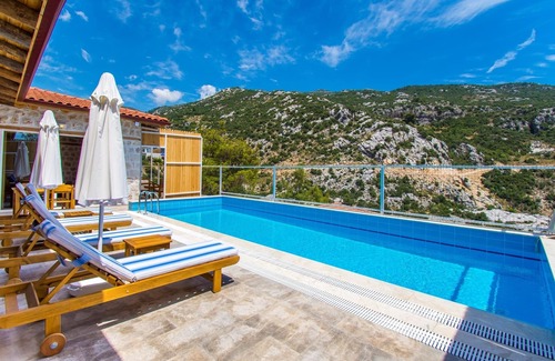 Built in the traditional materials of timber and stone , the villa has the advantage of being cool in the summer and warm in the winter, but is also fully air-conditioned. The accomodation is all on one floor and comprises of a large open plan lounge / kitchen / dining area , with high vaulted ceilings, and a double and twin bedroom, both with en-suite bathrooms. These all open onto a generous pool terrace, which is secluded from outside, making this an ideal choice for those guests desiring a high degree of privacy, be it for religious or other reasons.