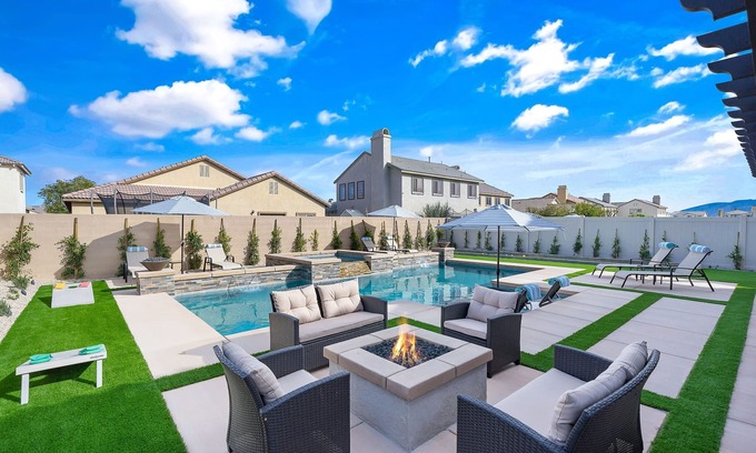 The backyard was professionally designed with a one of a kind resort experience in mind. It contains an expansive swimming pool with spa and tanning ledge. There are several designated tanning areas equipped with lounge chairs. Plenty of pool towels are provided for your stay. The back patio is covered with 2 cooling fans and a large 4k Smart TV to enjoy entertainment outside. There are 6 chaise lounge chairs with umbrellas that flank the saltwater pool and two lounge chairs with umbrellas on the tanning ledge in the pool. Backyard also includes fire urns, a fire pit with lounge area, and a natural gas BBQ.