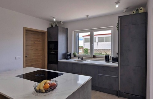 The new Villa Anso is located in the small hamlet of Milanezi near Višnjan, approx. 10 km from the sea and Poreč. With 185 m² of living space, the house offers plenty of room for up to 8 people (max. 6 adults). On the first floor of the high-quality furnished house, you will find a spacious living and dining area with an open kitchen, a guest WC and a utility room.
