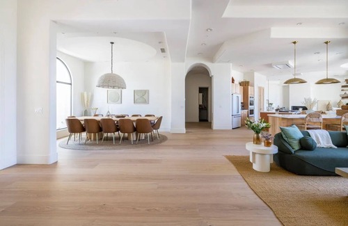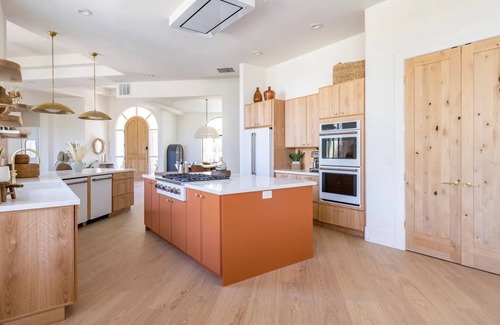 The perfect spa-like escape for up to 14 guests, this 5,720 sq foot 7 king bedroom/6.5 bath home on over an acre of land boasts a heated pool and spa, outdoor pizza oven, bocce ball court, drop down projector and screen, two interior fireplaces, blackout shades, and a Dolby Atmos surround sound system.