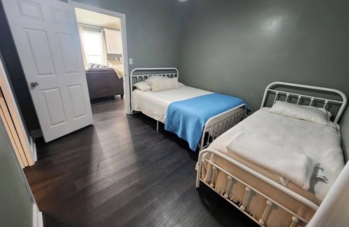 Bedroom 2 and 3: each with 1 queen bed, 1 twin bed and separated by a full bath.
