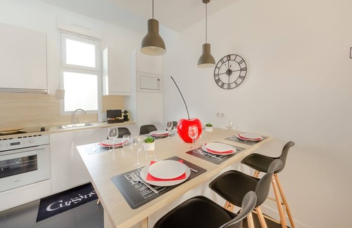 The kitchen is equipped with an oven, a stovetop, and a refrigerator, as well as a coffee maker, an electric kettle, and a microwave. Bathroom amenities include a hair dryer, towels, and shampoo. And you can even pack a bit lighter because there's a washer and dryer. Other amenities include bed sheets, an ironing board, heating, and a dining table.