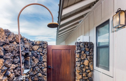 This newer-built studio will be a great getaway while you're in Waikoloa. Built in 2019, you'll love all of the modern furnishings and amenities provided including a microwave, mini fridge, and a private outdoor shower surrounded by lava rock to rinse off the sand from your day at the beach. Enjoy a quiet night in with the smart TV, fast WiFi, or catch up on your favorite novel under a flood of natural light on the flowered sofa. This is a great getaway for a couple on a Hawaiian vacation.