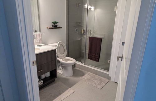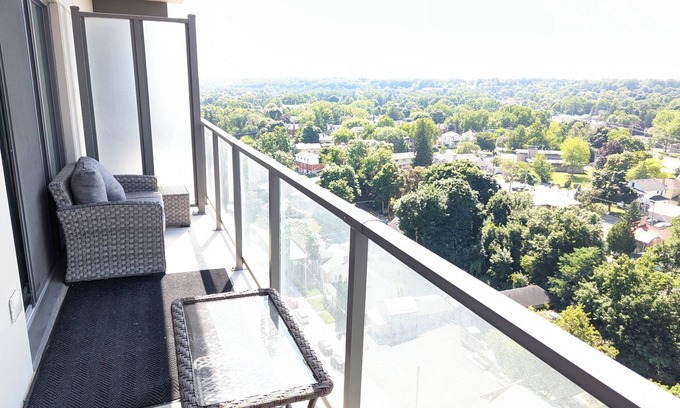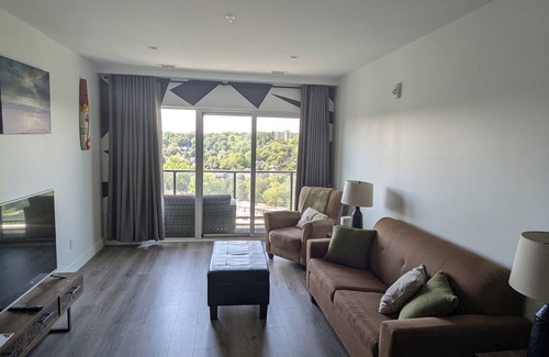 1 bedroom Condo, brand-new queen-size bed, open concept living, large balcony on 14 th floor overlooking forested neighborhood. Washer and dryer ensuite, pull out twin sofa bed in living room. Steps to Hamilton Theatre, foundry restaurant and Tapestry Hall, 5-minute walk to downtown Cambridge.
