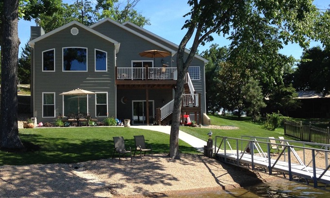 Enjoy the SUNSET COVE RETREAT's private dock with easy access on cove with a gentle slope pebble beach approximately 20 feet from grassy lawn, gently sloped, no steps. The pebble beach is great for the wee ones as well as the adults to go wading or sitting in the beach chair at water edge. Newer dock with swim/sun platform awaits you for a dip in the lake, sunning, or for those who prefer the shade area, SCR dock has it all as well as two boat wells (Boat well one 12’x20’; ready and easy access for your boat or pwcs - Guest usage: Boat well two 12’ x 32’ is not available for Guest usage.)
