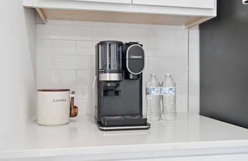 Step inside to an open concept living, dining, and kitchen area that’s perfect for gathering. The living room has cozy seating, a ROKU smart TV, and plenty of natural light. The fully stocked kitchen has everything you need to cook meals at home, with both fresh ground coffee and Keurig options to get your day started. The dining table comfortably seats your group so you can enjoy meals together.