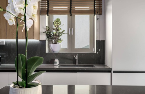 Step into our villa's inviting living room, furnished with elegant seating and a 55-inch HDTV with satellite channels. Adjacent to the living area is a fully-equipped kitchen featuring top-of-the-line appliances, including a dishwasher, oven, wine fridge, microwave, and Nespresso coffee machine.
