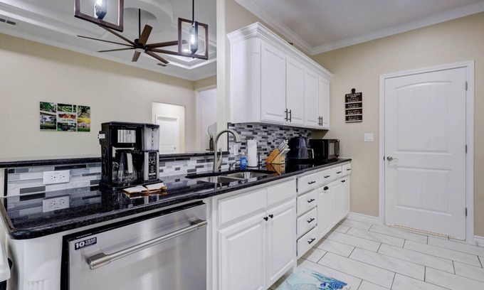 Dining room and kitchen are just a few steps away from the living room. Dining room has table seating for six with two bar seating at the bar area. Home has high chair and booster seat for the littles so need to worry we have you completley covered. Kitchen comes fully equipped with stainless steel appliances, pots, pans, silverware, and all the cooking utensils needed to make your families favorite meal.