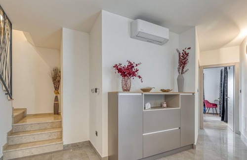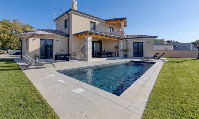 Villa Divina is a newly built, modern luxury villa with a private pool located in Stancija Portun near Porec. The ground floor has a large living room with a corner sofa, a fully equipped kitchen, one bedroom, a bathroom, and a toilet. Upstairs, there are 2 bedrooms and 2 bathrooms. From the living room, you can access a large terrace with a seating area, from which you can enjoy a beautiful view of the pool. A washing machine and a dryer are at the guest's disposal. In the beautifully landscaped courtyard, guests can enjoy a private pool, seating area, and BBQ grill. The villa is fully air-conditioned, has underfloor heating, and offers 2 parking spaces in front of the house. If you are planning a relaxing, peaceful vacation in a luxury villa near the sea near Porec - Villa Divina is the right choice. The first beach is just 2 kilometers away from the house.