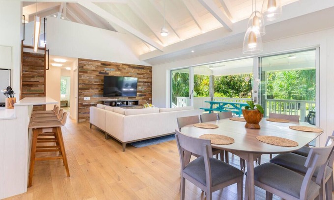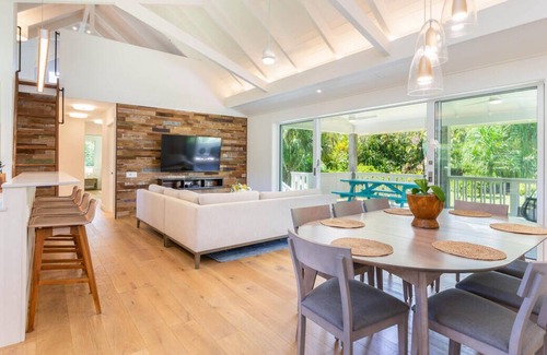 Ka Hale Olu at Anini Beach, near Hanalei, is an exclusive vacation rental located on the North Shore of Kauai, the Garden Island. With 3 bedrooms, an additional loft and 2 baths, Ka Hale Olu offers a true Hawai’ian vacation experience. In 2020, Ka Hale Olu went through a complete remodel. Everything in the home was rebuilt. Relax with your morning coffee on the spacious lanai as you gaze over the impossibly blue Pacific Ocean, just yards away. For your plugged-in convenience, Ka Hale Olu offers free WiFi and TV.