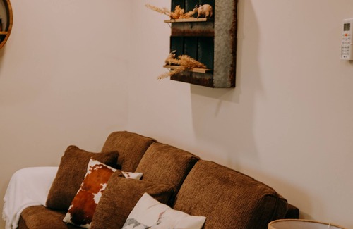 The Stables is a cozy mix of rustic and ranch, an old time feel introduced to modern amentites. With a private front porch facing hte soutn you can enjoy the sunrise to the east overlooking the neighboring farm. A lodging option suited for the family, the Stables sleeps six comfortably with a queen bed in the master bedroom, two twin beds in the upstairs loft accessed via a sturdy ladder and a sofa sleeper in the living room. The Stables also comes equipped with a full kitchen including appliances and cooking utensils. The living area features a smart TV and the home is equipped with fiber wifi.