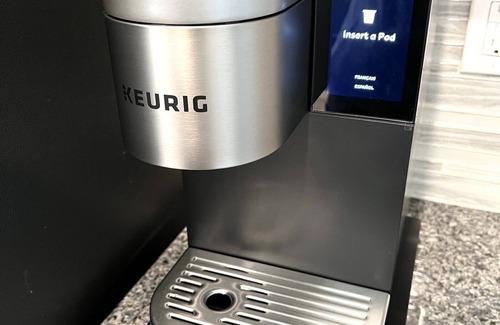 The gourmet kitchen is complete with stainless steel appliances, granite countertops, and a commercial-grade Keurig K-cup coffee maker.