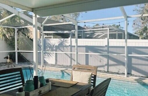 Private screen covered Lanai around the pool to help keep out the bugs, with covered roof protection from rain while still sitting outdoors. Pool is not heated.