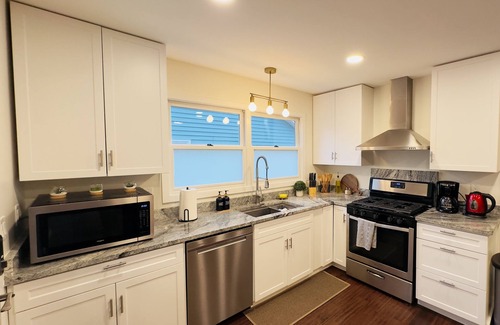 Both bathrooms are equipped with hair dryers and stocked with soap, shampoo, conditioner, and fresh towels. For a serene night's rest, choose between two rooms furnished with queen-sized beds and one room featuring two twin beds. One bathroom is outside two rooms, and one bathroom is in the master. The kitchen is fully equipped for culinary endeavors, boasting ample utensils, plates, glasses, cookware, bakeware, along with cooking oils and basic condiments. Should you require anything specific, kindly let us know before your stay! Feel free to bring your favorite laundry supplies to wash your clothing before packing to leave.