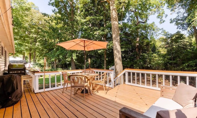 Newly remodeled home, spacious deck w/ string lights, & large yard with firepit on a quiet safe road. 2 car garage! Baby gate on stairs