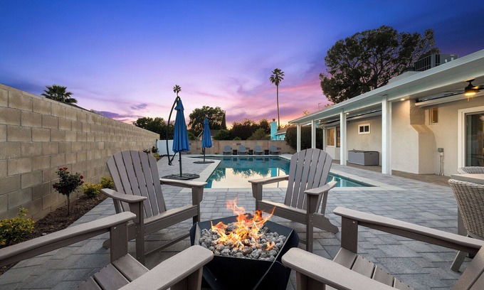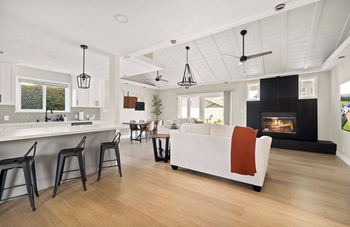 This beautifully renovated house features 3 bathrooms and 3 bedrooms, each with a king bed, ensuring everyone enjoys their own space. The spacious living area boasts stylish furnishings and a cozy fireplace, while the fully stocked kitchen with state-of-the-art appliances is perfect for culinary enthusiasts. Step outside to the backyard oasis, complete with an unheated pool, fire pit, BBQ grill, sun loungers, and a dining area.