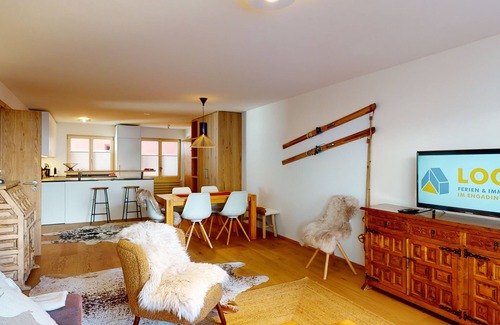 Newly renovated apartment on the 2nd floor (70m2) in Surlej with a balcony and mountain views.