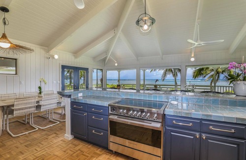 Just steps from the sand on Anini Beach, this spacious 3 bedroom home was JUST remodeled! With luxury furnishings and a gorgeous kitchen that will make even chef's mouths drop, this home is a true oasis on Anini Beach. Located near the end of Anini road, this home's serene setting and ocean views are unbeatable. An open living area with ample seating looks out over the water on Anini Beach. Cozy TV seating, coupled with dining tables and bar-top seating make this home perfect for families.
