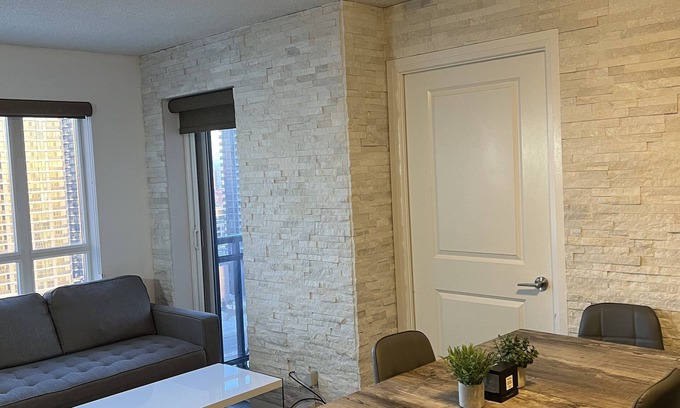 Great location, beautiful, clean, recently renovated 2 bedrooms, one king size bed with workspace area, one queen bed, 2 full bathrooms, one with a spacious glass standing shower with gorgeous tiles, second bathroom has deep tub ideal for the perfect bath, living room has a stunning feature brick wall & wonderful view. Also has mounted flat screen smartTV. High speed Internet. In unit washer+dryer. Everything you need for a great stay in Toronto. Walking distance to groceries store malls and more!